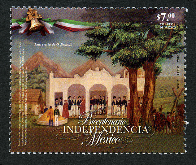 No. Scott: 2692 -- Año de Emisión: 2010 -- Valor Facial: $ 7.00 -- Multicolor -- Perforación: 13 1/4 x 13 -- Tipo de Impresión: Offset Timbre Postal Mexicano multicolor, alusivo al Bicentenario de la Independencia de México, la imagen muestra la entrevista de los señores generales O´Donojú y Novella con las Tres Garantías de Agustín de Iturbide. En la estampilla está escrito el valor facial de "$7.00", "CORREOS DE MÉXICO", "VIVEK, TIEV, 2010" y "Bicentenario de la INDEPENDENCIA de México". Para más información favor de dirigirse a biblioteca@mufi.org.mx