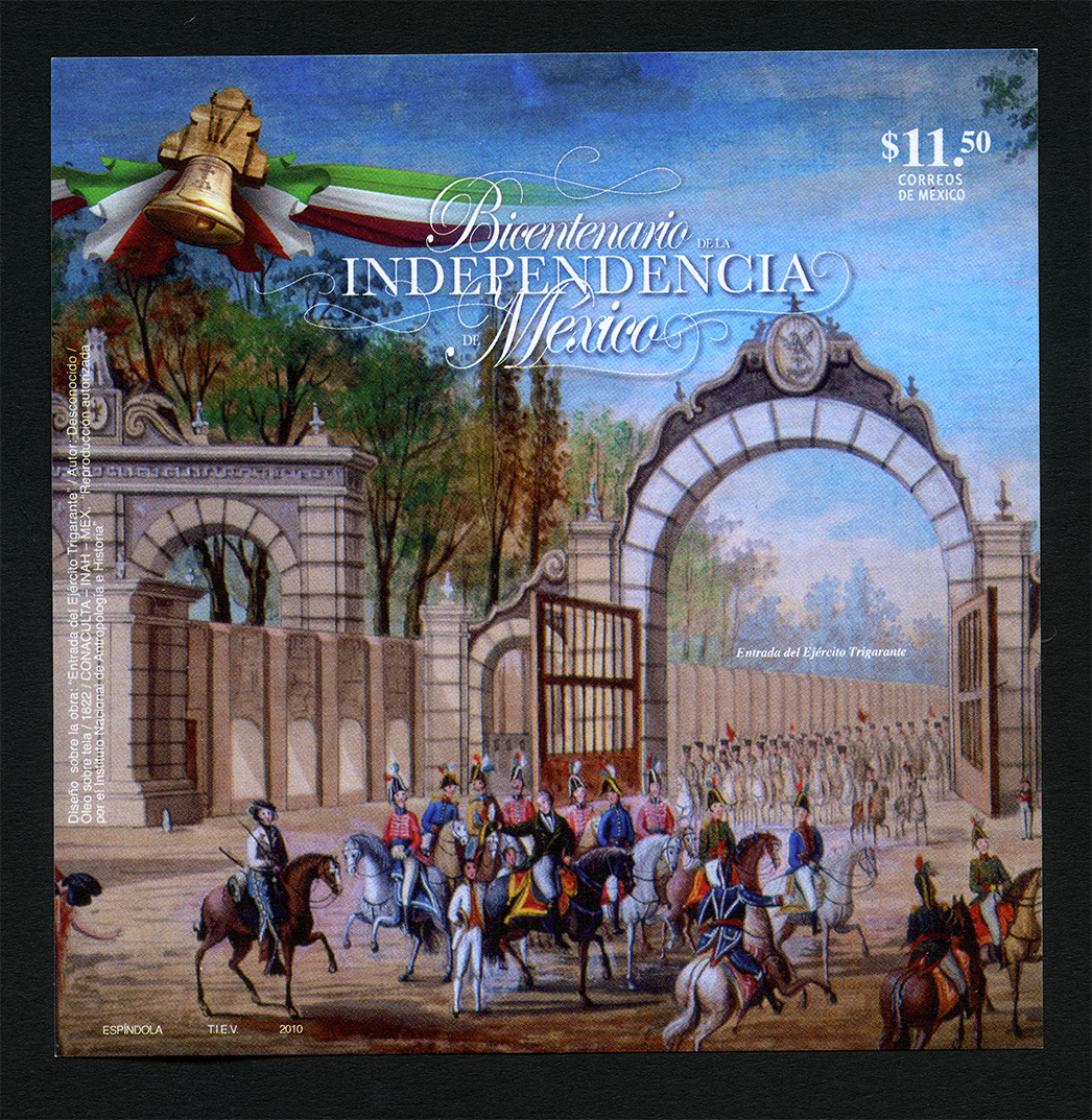 No. Scott: 2694 -- Año de Emisión: 2010 -- Valor Facial: $ 11.50 -- Multicolor -- Sin Perforación -- Tipo de Impresión: OffsetTimbre Postal Mexicano multicolor, alusivo al Bicentenario de la Revolución Mexicana, en la imagen se observa una escena de la entrada triunfal del Ejército Trigarante a la ciudad México, realizada el 27 de Septiembre de 1821, después de un acuerdo entre Iturbide y Juan O´Donojú firmaron un tratado en el que finalmente fue reconocida la Independencia de México. En la estampilla está escrito el valor facial de "$11.50", "CORREOS DE MÉXICO", "Bicentenario de la INDEPENDENCIA de México" y "ESPÍNDOLA, TIEV, 2010".