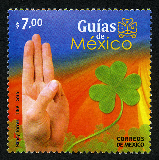 No. Scott: 2696 -- Año de Emisión: 2010 -- Valor Facial: $ 7.00 -- Multicolor -- Perforación: 13 -- Tipo de Impresión: Offset Timbre Postal Mexicano multicolor, sobre un mosaico multicolor, aparece una mano humana y un gran numero de hojas compuestas por tres folíolos redondeados, al lado de la mano se observa un trébol de gran tamaño. En la estampilla está escrito el valor facial de "$7.00", "Guías de México", "Nancy Torres, TIEV, 2010" y "CORREOS DE MÉXICO". Para más información favor de dirigirse a biblioteca@mufi.org.mx