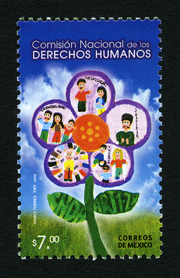 No. Scott: 2680 -- Año de Emisión: 2010 -- Valor Facial: $ 7.00 -- Multicolor -- Perforación: 13 -- Tipo de Impresión: OffsetTimbre Postal Mexicano multicolor, en la imagen aparece una ilustración infantil, al fondo se observa un cielo azul, con grandes nubes blancas, en frente aparece una flor con cinco círculos que figuran ser pétalos, dentro de cada uno hay diferentes personas entre los cuales aparecen adultos y niños, abajo de los círculos hay dos pétalos, en uno está escrito CNDH y ART 12. En la estampilla está escrito "Comisión Nacional de los DERECHOS HUMANOS", "NANCY TORRES, TIEV, 2010" y "CORREOS MÉXICO".