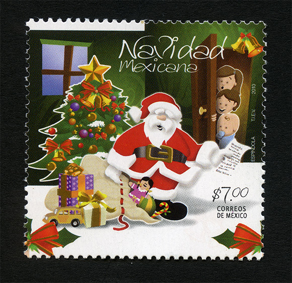 No. Scott: 2702 -- Año de Emisión: 2010 -- Valor Facial: $ 7.00 -- Multicolor -- Perforación: 13 -- Tipo de Impresión: Offset Timbre Postal Mexicano multicolor, la imagen representa una ilustración infantil, en ella aparece el interior de una habitación, al fondo hay tres niños asomándose en una puerta, aparece también una ventana, en medio se observa un árbol adornado con motivos navideños y en primer plano está Santa Claus, con una gran cantidad de regalos. Sobre la estampilla está escrito "Navidad Mexicana", "ESPÍNDOLA, TIEV, 2010", "$7.00" y "CORREOS DE MÉXICO". Para más información favor de dirigirse a biblioteca@mufi.org.mx