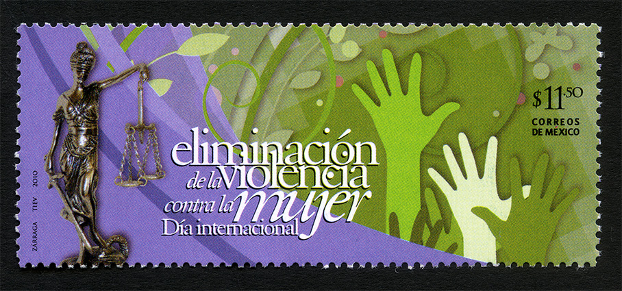 No. Scott: 2720 -- Año de Emisión: 2010 -- Valor Facial: $11.50 -- Multicolor -- Perforación:13 1/4 x 13 -- Tipo de Impresión: Offset Timbre Postal Mexicano multicolor, al fondo de la imagen y sobre un mosaico multicolor, se observa una gran variedad de figuras y trazos, destacando varias manos humanas, del lado derecho aparece La Balanza, que representa el símbolo más conocido de la justicia. Sobre la estampilla está escrito el valor facial de "$11.50", "CORREOS DE MÉXICO", "Día Internacional de la eliminación de la violencia contra las mujeres" y "ZÁRRAGA, TIEV, 2010". Para más información favor de dirigirse a biblioteca@mufi.org.mx