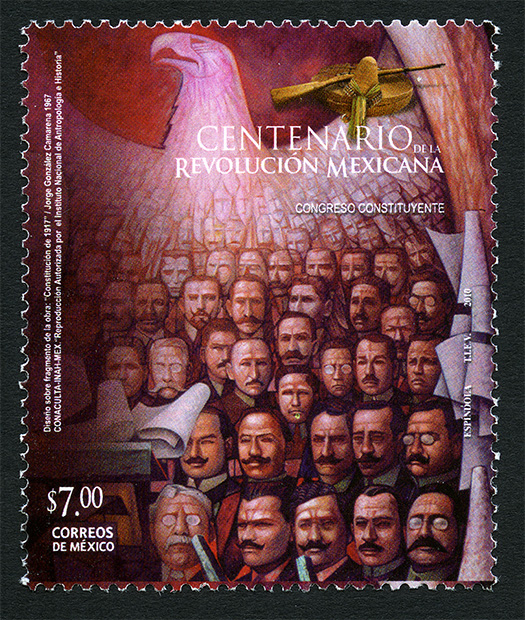 No. Scott: 2712 -- Año de Emisión: 2010 -- Valor Facial: $7.00 -- Multicolor -- Perforación: 13 x 13 1/4 -- Tipo de Impresión: OffsetTimbre Postal Mexicano multicolor, alusivo al Centenario de la Revolución Mexicana, en la imagen se observa un águila mexicana, al frente de ella aparecen muchos rostros de diputados constituyentes, entre los que destacan de derecha a izquierda y de abajo hacia arriba, Esteban Baca Calderón, Heriberto Jara, Francisco José Múgica, José Natividad Macías, Alfonso Cravioto etc. Sobre la estampilla está escrito "CENTENARIO DE LA REVOLUCIÓN MEXICANA", "CONGRESO CONSTITUYENTE", "ESPÍNDOLA, TIEV. 2010", el valor facial de "$7.00" y "CORREOS DE MÉXICO".