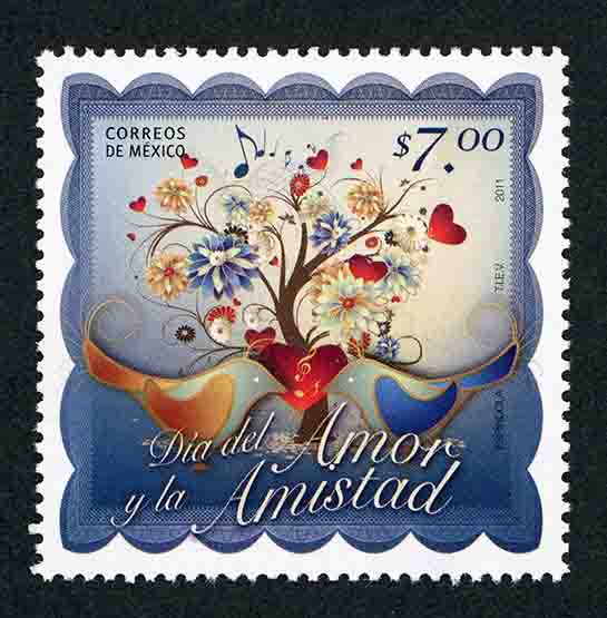 No. Scott: 2730 -- Año de Emisión: 2011 -- Valor Facial: $ 7.00 -- Multicolor -- Con Perforación: 13 -- Tipo de Impresión: Offset Timbre Postal Mexicano, alusivo al Día del Amor y la Amistad, al fondo de la imagen se observa el tronco de un árbol con ramas delgadas, en ellas aparecen una gran variedad de flores de diferentes tamaños y colores, además de varios corazones grandes y pequeños, en primer plano hay dos palomas y en medio un corazón. Sobre la estampilla está escrito "CORREOS DE MÉXICO", el valor facial de "$7.00", "ESPÍNDOLA, TYIEV, 2011" y "Día del Amor y la Amistad". Para más información favor de dirigirse a biblioteca@mufi.org.mx