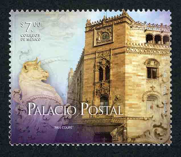 No. Scott: 2735 -- Año de Emisión: 2011 -- Valor Facial: $ 7.00 -- Multicolor -- Con Perforación: 13 -- Tipo de Impresión: Offset Timbre Postal Mexicano multicolor, en la imagen se observa la fachada del edificio del Palacio Postal, conocido también como Quinta Casa de Correos, este edificio consta de cuatro niveles y fue construido a comienzos del siglo XX, la fachada principal en Pau-Coupé (es decir que cuenta con un chaflán en la esquina) muestra un reloj en su último nivel. Sobre la estampilla está escrito el valor facial de "$7.00", "CORREOS DE MÉXICO", "VENEGAS, TIEV, 2010", "PALACIO POSTAL" Y "PAN-COUPÉ". Para más información favor de dirigirse a biblioteca@mufi.org.mx