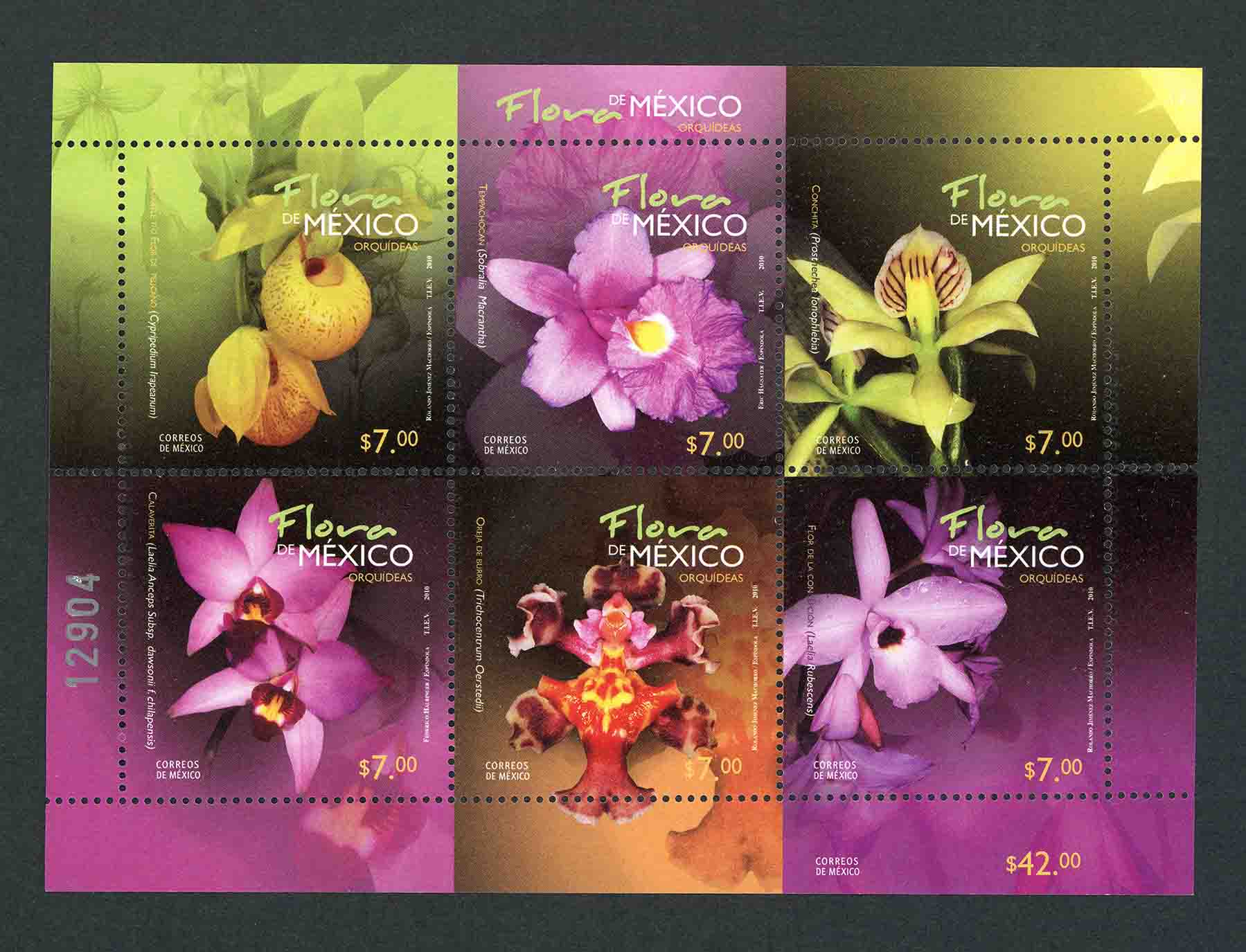 No. Scott: 2728 -- Año de Emisión: 2010 -- Valor Facial: $ 42.00 -- Multicolor -- Con Perforación: 13 -- Tipo de Impresión: Offset Hoja Recuerdo de México con seis Timbres Postales multicolores, en cada estampilla aparecen diferentes tipos de Orquídeas, en el primero se observa la especie Cypripedium Irapeanum, en el segndo, Sobralia Macrantha, tercero, Prosthechea Lonophiebia, en el cuarto Laelia Anceps Subspacies, en el quinto Trichocentrum Oerstedi y en el último Laelia Rubescens. En cada timbre está escrito "Flora de México ORQUÍDEAS", "CORREOS DE MÉXICO" y el valor facial de "$7.00". Para más información favor de dirigirse a biblioteca@mufi.org.mx