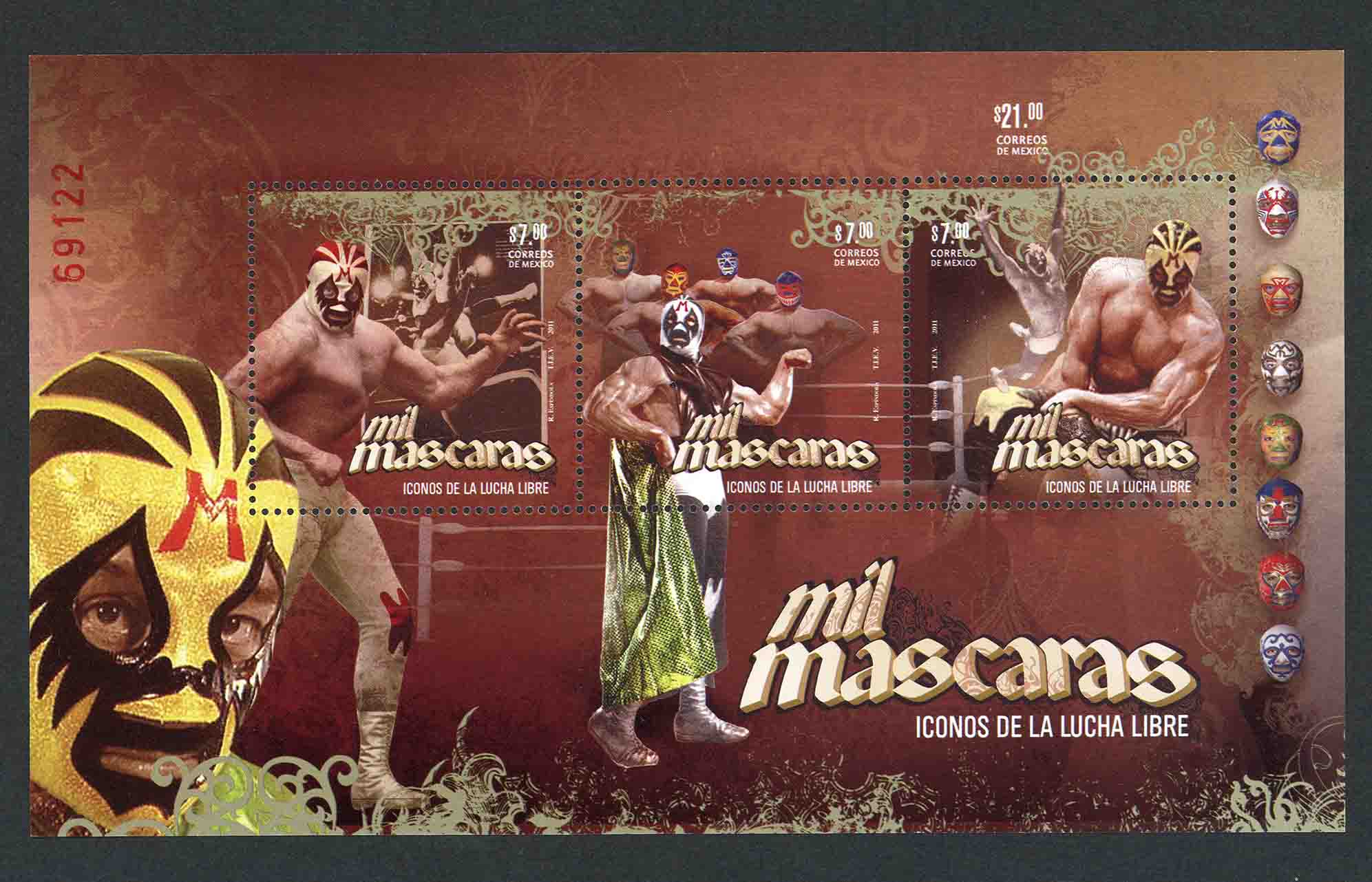 No. Scott: 2736 -- Año de Emisión: 2011 -- Valor Facial: $ 21.00 -- Multicolor -- Con Perforación: 13 -- Tipo de Impresión: Offset Hoja Recuerdo de México con tres Timbres Postales multicolores, alusivos al Luchador Profesional El Mil Máscaras, en cada estampilla se observa al personaje realizando diferentes poses de luchador y portando diferentes atuendos y máscaras, en la parte inferior de la hoja, aparece el retrato del combatiente y en el contorno derecho hay una hilera de ocho mascaritas ubicadas de arriba hacia abajo. En cada estampilla está escrito el valor facial, "CORREOS DE MÉXICO", "Mil Máscaras", "ÍCONOS DE LA LUCHA LIBRE" y "TIEV, 2011". Para más información favor de dirigirse a biblioteca@mufi.org.mx