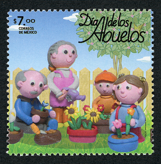 No. Scott: 2740 -- Año de Emisión: 2011 -- Valor Facial: $ 7.00 -- Multicolor -- Con Perforación: 13 -- Tipo de Impresión: Offset Timbre Postal Mexicano multicolor, en él aparece una ilustración infantil, al fondo se observa un cielo azul, enseguida hay un árbol con flores, en frente unas rejas de madera, en primer plano aparecen dos abuelitos, hombre y mujer, al lado de ellos hay una niña y un niño, adelante, aparecen macetas con diferentes tipos de flores.En la parte superior está escrito el valor facial de "$7.00", "CORREOS DE MÉXICO", "Día de los Abuelos" y "TIEV, 2011". Para más información favor de dirigirse a biblioteca@mufi.org.mx