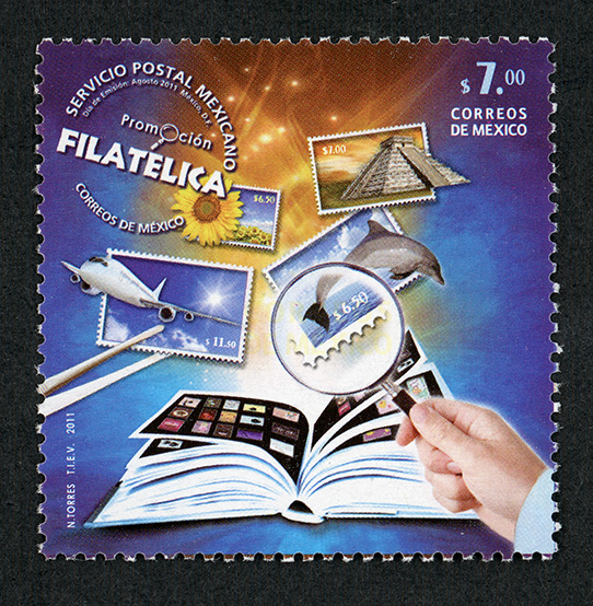 No. Scott: 2742 -- Año de Emisión: 2011 -- Valor Facial: $ 7.00 -- Multicolor -- Con Perforación: 13 -- Tipo de Impresión: Offset Timbre Postal Mexicano multicolor, sobre un mosaico multicolor se observan diferentes estampillas postales en las que sobresalen una pirámide prehispánica, una flor, una foca y un avión, en medio hay un álbum abierto con timbres postales y en primer plano aparece una mano humana sujetando una lupa. Sobre la estampilla está escrito "SERVICIO POSTAL MEXICANO, Promoción FILATÉLICA, CORREOS DE MÉXICO", el valor facial de "$7.00", "CORREOS DE MÉXICO" y "N.TORRES, TIEV, 2011". Para más información favor de dirigirse a biblioteca@mufi.org.mx