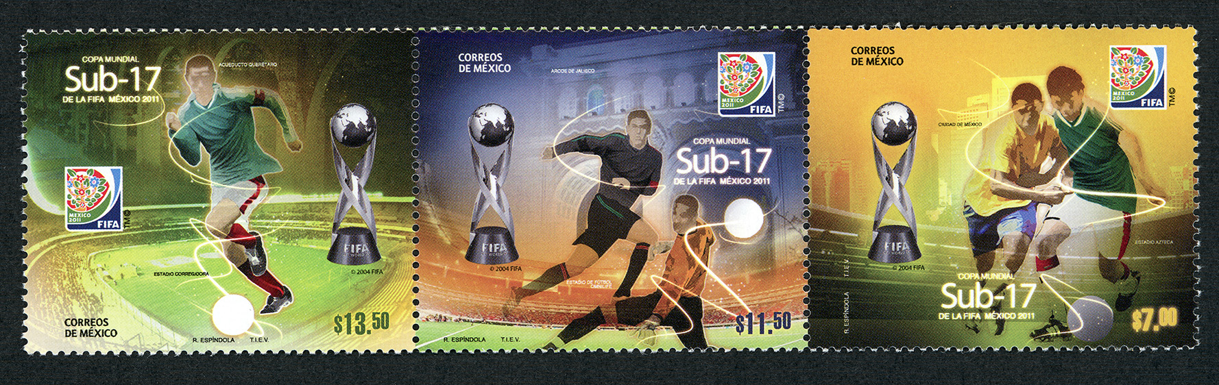 No. Scott: 2739 -- Año de Emisión: 2011 -- Valor Facial: $ 32.00 -- Multicolor -- Con Perforación: 13 1/4 x 13 -- Tipo de Impresión: Offset Tira de tres Timbres Postales de México, alusivos a la Copa Mundial, Sub 17 de la FIFA MÉXICO 2011, en las estampillas aparecen diferentes estadios de futbol y jugadores en movimiento,así como la copa de la FIFA. En cada timbre está escrito "CORREOS DE MÉXICO", "MÉXICO 2011 FIFA", "COPA MUNDIAL Sub 17 DE LA FIFA MÉXICO 2011", "R. ESÍNDOLA, TIEV" y el valor facial. Para más información favor de dirigirse a biblioteca@mufi.org.mx