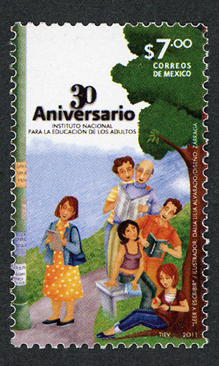 No. Scott: 2746 -- Año de Emisión: 2011 -- Valor Facial: $ 7.00 -- Multicolor -- Con Perforación: 13 1/4 x 13 -- Tipo de Impresión: OffsetTimbre Postal Mexicano multicolor, en la imagen aparece una ilustración infantil, en la que se observa un paisaje con un cielo azul, sobre una montaña aparece un grupo de personas adultas de hombres y mujeres, algunos permanecen de pie y otros están sentados, la mayoría sostienen libros en sus manos, en primer plano hay parte de un árbol con un tronco grueso y frondosa ramificación. Sobre la estampilla está escrito el valor facial de "$7.00", "CORREOS DE MÉXICO", "30 Aniversario INSTITUTO NACIONAL PARA LA EDUCACIÓN DE LOS ADULTOS" y "TIEV, 2011".