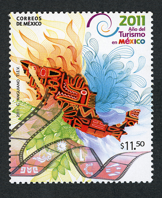 No. Scott: 2749 -- Año de Emisión: 2011 -- Valor Facial: $ 11.50 -- Multicolor -- Con Perforación:13 x 13 1/4 -- Tipo de Impresión: OffsetTimbre Postal Mexicano alusivo al Año Turístico 2011 en México, sobre un mosaico multicolor con diferentes formas y tamaños, se observa el mapa de la República Mexicana, realizado con grecas prehispánicas con dibujos y figuras escalonadas, en la parte frontal aparece una cinta cinematográfica en color rojo y orillas negras. Sobre la estampilla está escrito "CORREOS DE MÉXICO", "2011, Año del Turismo en México", "2011, C. ANGUIANO, TIEV" y el valor facial de "$11.50".