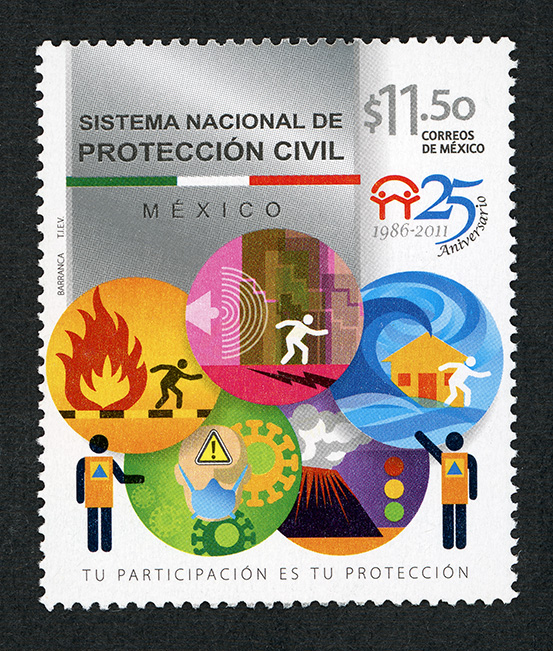 No. Scott: 2751 -- Año de Emisión: 2011 -- Valor Facial: $ 11.50 -- Multicolor -- Con Perforación: 13 x 13 1/4 -- Tipo de Impresión: OffsetTimbre Postal Mexicano multicolor, en la imagen, en la imagen se observan cinco esferas multicolores de desastres naturales, en cada una aparecen señalamientos emitidos por el Sistema Nacional de Protección Civil como son: Incendios Forestales, Sismos, Huracanes, Virus y Volcanes. En la estampilla está escrito "SISTEMA NACIONAL DE PROTECCIÓN CIVIL MÉXICO", el valor facial de "$11.50", "CORREOS DE MÉXICO", "BARRANCA TIEV" y "TU PARTICIPACIÓN ES TU PROTECCIÓN".
