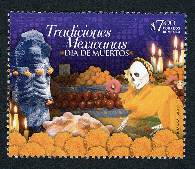 No. Scott: 2758 -- Año de Emisión: 2011 -- Valor Facial: $ 7.00 -- Multicolor -- Con Perforación: 13 1/4 x 13 -- Tipo de Impresión: OffsetTimbre Postal Mexicano multicolor, en la imagen se observa un altar tradicional mexicano con motivo del Día de Muertos, al fondo aparece papel picado en color morado, adelante una mesa con una gran variedad de frutas, calaveritas de dulce y velas encendidas, después está la escultura de Mictecacíhuatl, Diosa de la Muerte y una calavera vestida con colores llamativos, en primer plano hay un pan cubierto de azúcar y muchas flores de cempasúchil. En la estampilla está escrito el valor facial de "$7.00", "CORREOS DE MÉXICO", "Tradiciones Mexicanas DÍA DE MUERTOS " y "H. BAEZ / ZÁRRAGA / TIEV / 2011".