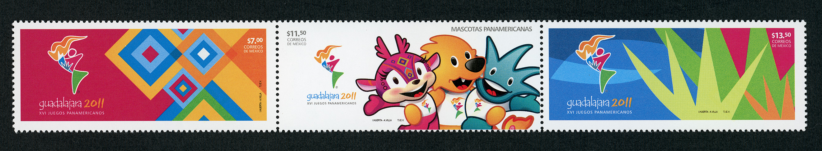 No. Scott: 2755 -- Año de Emisión: 2011 -- Valor Facial: $ 32.00 -- Multicolor -- Con Perforación: 13 1/4 x 13 -- Tipo de Impresión: OffsetTira de tres Timbres Postales multicolores, alusivos a los XVI Juegos Panamericanos Guadalajara 2011, en el primero aparece el emblema de los juegos el cual está representado por el Continente Americano y el deporte olímpico expresado a través de la flama, en el segundo se observan a las mascotas que tuvieron de nombre Huichi, era una venada color rosa, un león y una planta de agave, en el tercero aparece la planta de agave. En cada estampilla está escrito el valor facial, "CORREOS DE MÉXICO", "Guadalajara 2011, XVI JUEGOS PANAMERICANOS" y "I. HUERTA, A. ÁVILA, TIEV".