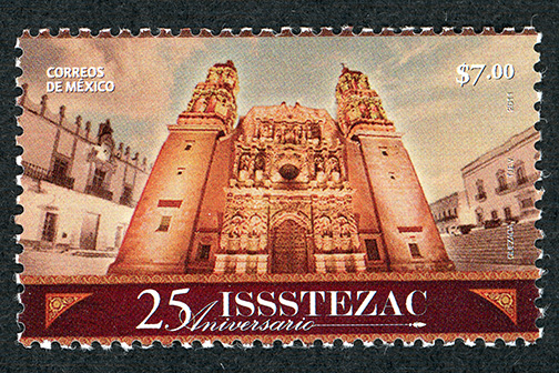 No. Scott: 2760 -- Año de Emisión: 2011 -- Valor Facial: $ 7.00 -- Multicolor -- Con Perforación: 13 x 13 1/4 -- Tipo de Impresión: Offset Timbre Postal Mexicano multicolor, en la imagen se observa la fachada de la Catedral de la Ciudad de Zacatecas, la cual se caracteriza por su estilo churrigueresco, está elaborada de dos torres y tres fachadas, la fachada principal está dedicada a la Eucaristía. Sobre la estampilla está escrito "CORREOS DE MÉXICO", el valor facial de "$7.00", "QUEZADA, TIEV, 2011" y "25 Aniversario ISSSTEZAC". Para más información favor de dirigirse a biblioteca@mufi.org.mx