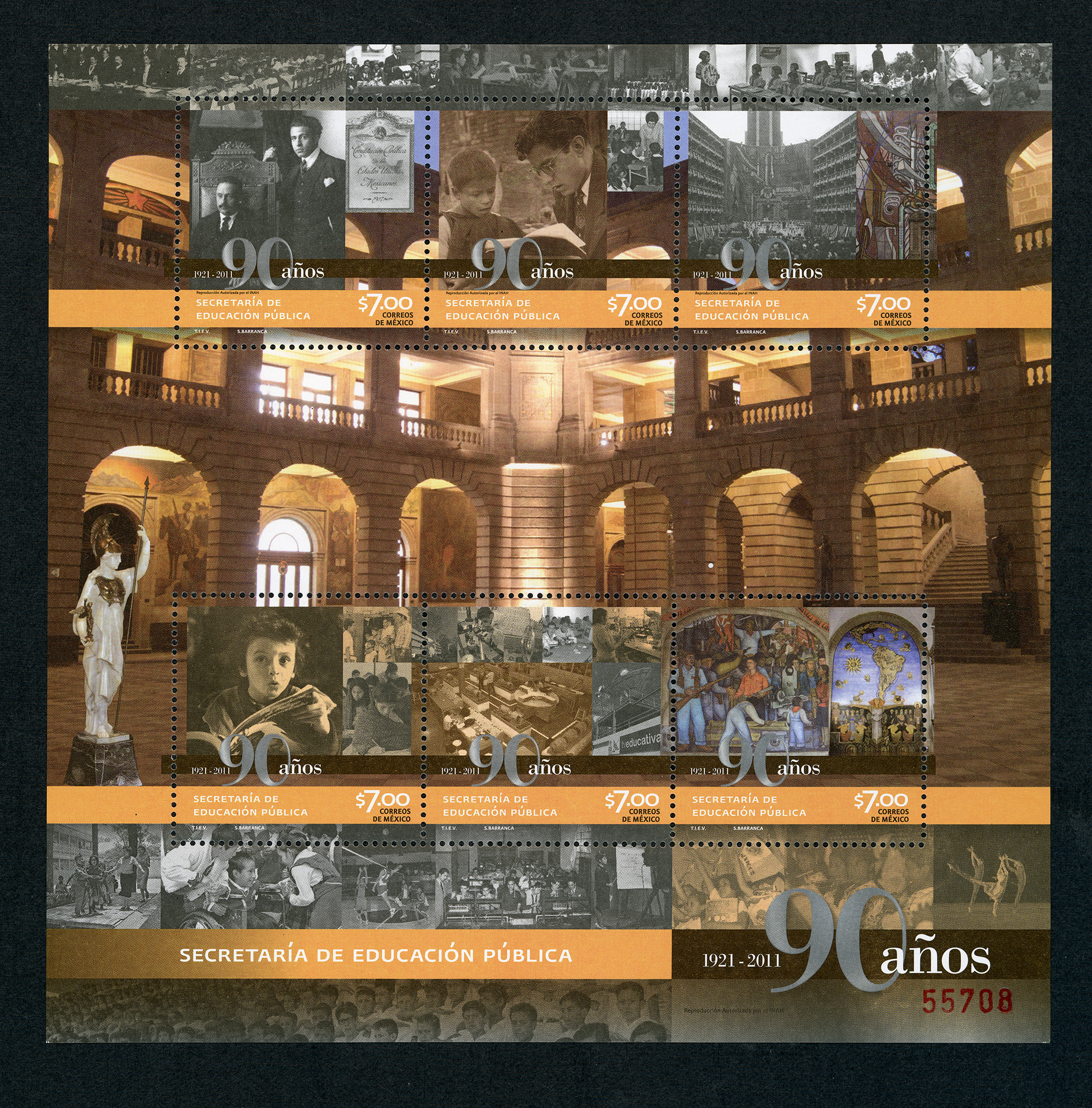 No. Scott: 2754 -- Año de Emisión: 2011 -- Valor Facial: $ 42.00 -- Multicolor -- Con Perforación: 13 -- Tipo de Impresión: OffsetHoja Recuerdo con seis Timbres multicolores de México, alusiva a los 90 Años de la Secretaría de Educación Pública, en la primera estampilla de la parte superior aparece el retrato del político, escritor y educador José Vasconcelos Calderón, en la segunda hay un adulto leyéndole a un niño y una maestra con un grupo de niños, en la tercera hay un edificio y murales, en la cuarta, está un niño leyendo, una familia y adultos mayores escribiendo, en la quinta hay escenas de escuelas y laboratorios y en la última se observan murales. En la hoja y timbres está escrito "90 Años1921-2011", "SECRETARIA DE EDUCACIÓN PÚBLICA", el valor facial de "$7.00", "CORREOS DE MÉXICO" y "TIEV, S. BARRANCA".