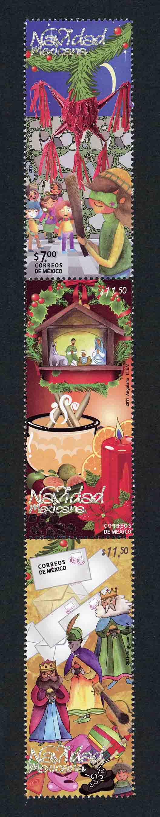 No. Scott: 2765 -- Año de Emisión: 2011 -- Valor Facial: $ 30.00 -- Multicolor -- Con Perforación: 13 1/4 x 13 -- Tipo de Impresión: OffsetTira de tres Timbres Postales multicolores de México, alusivos a la Navidad, en el primero se observa a un grupo de niños rompiendo una piñata, en el segundo aparece una casita de madera rodeada de una corona en color verde y dentro de ella está José, la Virgen María, el Niño Dios y un burrito, abajo hay una tasa con bebida y una vela encendida, en la tercera estampilla hay muchos sobres en color blanco, regalos y los Reyes Magos. En cada Timbre está escrito "CORREOS DE MÉXICO", el valor facial, "2011, Anguiano, TIEV" y "Navidad Mexicana".