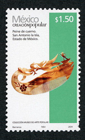 No. Scott: 2490f -- Año de Emisión: 2011 -- Valor Facial: $ 1.50 -- Multicolor -- Perforación: 13 1 /4 x 13 -- Tipo de Impresión: Offset EstucadoTimbre Postal Mexicano multicolor, perteneciente a la serie permanente México Creación Popular, en la imagen aparece un peine de cuerno en forma de pez, en la parte de arriba aparecen figuras de animales marinos y al extremo aparece la silueta de un hombre, dentro de una balsa, esta pieza fue realizada en el municipio de San Antonio la Isla, Estado de México. Sobre la estampilla está escrito "México CREACIÓN POPULAR", el valor facial de "$1.50", "Peine de cuerno. San Antonio la Isla, Estado de México", "COLECCIÓN MUSEO DE ARTE POPULAR" y "Barranca, TIEV, 2011".