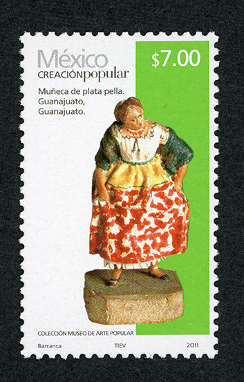 No. Scott: 2499e -- Año de Emisión: 2011 -- Valor Facial: $ 7.00 -- Multicolor -- Perforación: 13 1 /4 x 13 -- Tipo de Impresión: Offset EstucadoTimbre Postal Mexicano multicolor, perteneciente a la serie permanente México Creación Popular, en la imagen se observa una muñeca hecha de plata pella, su ropa es colorida, lleva en la espalda un rebozo en color verde, que aparece sobre sus hombros, ella está parada en una piedra de gran tamaño. En la estampilla está escrito "México CREACIÓN POPULAR", el valor facial de "$ 7.00", "Muñeca de plata pella. Guanajuato, Guanajuato", "COLECCIÓN MUSEO DE ARTE POPULAR" y "Barranca, TIEV, 2010".