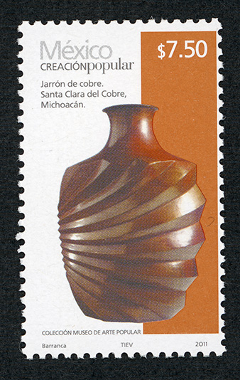 No. Scott: 2500f -- Año de Emisión: 2011 -- Valor Facial: $ 7.50 -- Multicolor -- Perforación: 13 1 /4 x 13 -- Tipo de Impresión: Offset EstucadoTimbre Postal Mexicano multicolor, perteneciente a la serie permanente México Creación Popular, en la imagen se observa un recipiente en forma de vaso alto, copa o jarro grande, hecho de cobre y elaborado en el Estado de Michoacán. En la estampilla está escrito "México CREACIÓN POPULAR", el valor facial de "$ 7.50", "Jarrón de cobre. Santa Clara del Cobre, Michoacán", "COLECCIÓN MUSEO DE ARTE POPULAR" y "Barranca, TIEV, 2011".