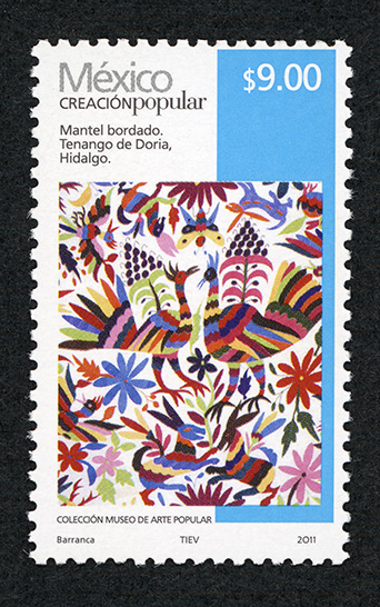 No. Scott: 2501b -- Año de Emisión: 2011 -- Valor Facial: $ 9.00 -- Multicolor -- Perforación: 13 1 /4 x 13 -- Tipo de Impresión: Offset Estucado Timbre Postal Mexicano multicolor, perteneciente a la serie permanente México Creación Popular, en la imagen se observa un mosaico multicolor, que dan forma a flores, árboles y animales, posiblemente esta pieza esté elaborada a mano. En la estampilla está escrito "México CREACIÓN POPULAR", el valor facial de "$ 9.00", "Mantel bordado. Tenango de Doria, Hidalgo", "COLECCIÓN MUSEO DE ARTE POPULAR" y "Barranca, TIEV, 2011". Para más información favor de dirigirse a biblioteca@mufi.org.mx