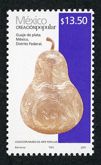 No. Scott: 2503De -- Año de Emisión: 2011 -- Valor Facial: $ 13.50 -- Multicolor -- Perforación: 13 1 /4 x 13 -- Tipo de Impresión: Offset EstucadoTimbre Postal Mexicano multicolor, perteneciente a la serie permanente México Creación Popular, en la imagen se observa un guaje de plata, pieza realizada a mano por escultores que se dedican a la orfebrería y tiene detalles mexicanos. Sobre la estampilla está escrito "México CREACIÓN POPULAR", el valor facial de "$ 13.50", "Guaje de plata. México, Distrito Federal", "COLECCIÓN MUSEO DE ARTE POPULAR" y "Barranca, TIEV, 2011".