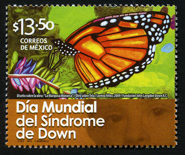 No. Scott: 2775 -- Año de Emisión: 2012 -- Valor Facial: $ 13.50 -- Multicolor -- Perforación: 13 1/4 x 13 -- Tipo de Impresión: Offset Timbre Postal Mexicano multicolor, en la parte superior y sobre un fondo multicolor, se observa una mariposa con alas brillantes color anaranjado, con venas negras y manchas blancas a lo largo de los bordes, en la parte inferior y sobre un fondo amarillo ocre aparece parte de la cara de un niño. Sobre la estampilla está escrito el valor facial de "$13.50", "CORREOS DE MÉXICO", "Día Mundial del Síndrome de Down" y "TIEV, 2012, S. BARRANCA". Para más información favor de dirigirse a biblioteca@mufi.org.mx