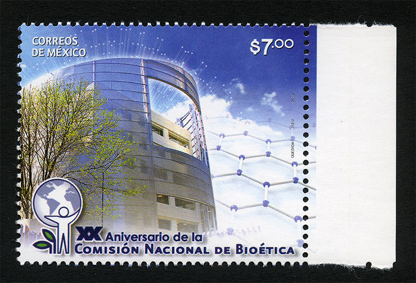 No. Scott: 2776 -- Año de Emisión: 2012 -- Valor Facial: $ 7.00 -- Multicolor -- Perforación: 13 1/4 x 13 -- Tipo de Impresión: OffsetTimbre Postal Mexicano multicolor, al fondo de la imagen se observa un cielo azul con una gran cantidad de nubes, a un lado aparecen varias figuras geométricas en forma de hexágonos unidas entre sí, en medio está la parte frontal del edificio de la Comisión Nacional de Bioética, en la parte frontal un árbol que cubre una pequeña parte de la fachada.En la parte superior está escrito "CORREOS DE MÉXICO", el valor facial de "$7.00", en la parte inferior está impreso el logotipo y el "XX Aniversario de la Comisión Nacional de Bioética".