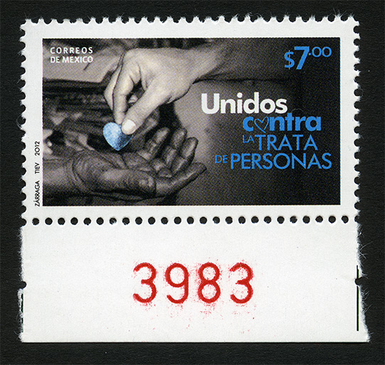 No. Scott: 2777 -- Año de Emisión: 2012 -- Valor Facial: $ 7.00 -- Multicolor -- Perforación: 13 x 13 1/4 -- Tipo de Impresión: Offset Timbre Postal Mexicano multicolor con borde blanco en la parte inferior y con el número 3983, en la imagen se observan dos manos humanas, una de ellas está ligeramente arriba y sujetando un corazón pequeño en color azul, la mano de abajo está extendida recibiendo el corazón. Sobre la estampilla está escrito "CORREOS DE MÉXICO", el valor facial de "$7.00", "ZÁRRAGA, TIEV, 2012" y "Unidos Contra la TRATA DE PERSONAS". Para más información favor de dirigirse a biblioteca@mufi.org.mx