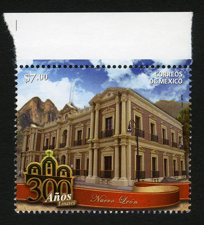 No. Scott: 2778 -- Año de Emisión: 2012 -- Valor Facial: $ 7.00 -- Multicolor -- Perforación: 13 1/4 x 13 -- Tipo de Impresión: Offset Timbre Postal Mexicano multicolor, con borde blanco en la parte superior, al fondo de la imagen se observa un cielo azul con nubes y parte de la montaña llamada El Cerro de la Silla, al frente aparece el edificio del Palacio Municipal, realizado en dos niveles en estilo neoclásico, con decoraciones en terracota modernista. Sobre la estampilla está escrito el valor facial de "$7.00", "CORREOS DE MÉXICO", "QUEZADA, TIEV, 2012" y "300 Años Linares Nuevo León". Para más información favor de dirigirse a biblioteca@mufi.org.mx
