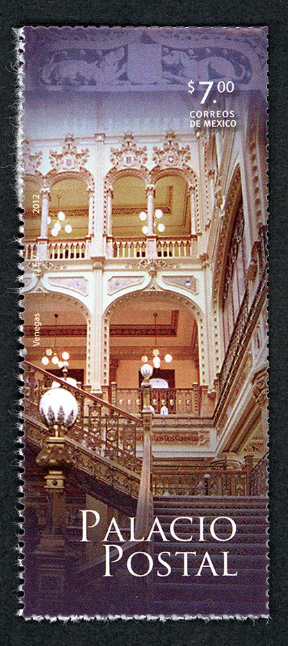 No. Scott: 2871 -- Año de Emisión: 2012 -- Valor Facial: $ 7.00 -- Multicolor -- Perforación: 13 x 13 1/4 -- Tipo de Impresión: OffsetTimbre Postal Mexicano multicolor, en la imagen se observa parte del interior del Palacio Postal de México, esta obra también es llamada La Quinta Casa de Correos y se encuentra en el Centro Histórico de la Ciudad de México, está elaborado de arquitectura ecléctica, construida a inicios del siglo XX, como uno de los símbolos del Porfiriato. Este edificio se encuentra ornamentada con mármoles de carra y herrería de bronce dorada, sobre la estampilla está escrito el valor facial de "$7.00", "CORREOS DE MÉXICO", "Venegas, TIEV, 2012" Y "PALACIO POSTAL".
