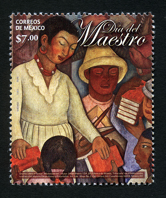 No. Scott: 2783 -- Año de Emisión: 2012 -- Valor Facial: $ 7.00 -- Multicolor -- Perforación: 13 x 13 1/4 -- Tipo de Impresión: Offset Timbre Postal Mexicano multicolor, alusivo al Día del Maestro, en la imagen se observa una obra del pintor mexicano Diego Rivera titulado "Alfabetización", en ella aparece una mujer indígena repartiendo libros a los niños que están alrededor, ella porta un vestido color blanco con aretes y collar rojos, al lado, se observan dos hombres adultos cargando varios libros. Sobre la estampilla está escrito "CORREOS DE MÉXICO", el valor facial de "$7.00" y "QUEZADA, TIEV, 2012". Para más información favor de dirigirse a biblioteca@mufi.org.mx