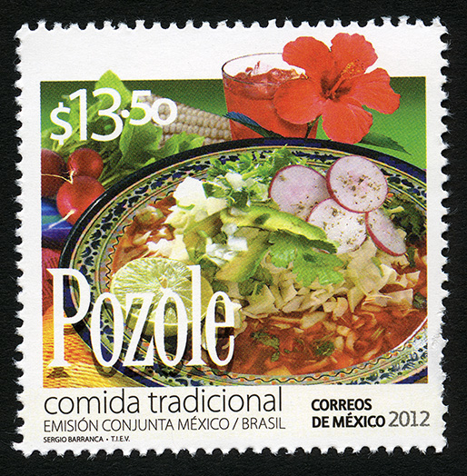 No. Scott: 2784 -- Año de Emisión: 2012 -- Valor Facial: $ 13.50 -- Multicolor -- Perforación: 13 -- Tipo de Impresión: Offset Timbre Postal Mexicano multicolor, en la imagen se observa un plato de sustancias alimenticias en las que destacan la lechuga, aguacate, rábano, cilantro y limón, alrededor de él aparecen otros alimentos y un vaso de agua de sabor, con una flor roja. Sobre la estampilla está escrito el valor facial de "$13.50", "Pozole", "comida tradicional EMISIÓN CONJUNTA MÉXICO/BRASIL", "SERGIO BARRANCA, TIEV", "CORREOS DE MÉXICO 2012". Para más información favor de dirigirse a biblioteca@mufi.org.mx