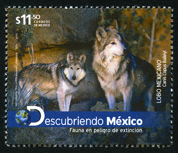 No. Scott: 2786 -- Año de Emisión: 2012 -- Valor Facial: $ 11.50 -- Multicolor -- Perforación: 13 1/4 x 13 -- Tipo de Impresión: OffsetTimbre Postal Mexicano multicolor, al fondo de la imagen se observa un bosque con montañas y muy poca vegetación, al frente hay dos lobos mexicanos, los cuales son mamíferos en peligro de extinción, su tamaño es parecido a la un perro mediano, su cuerpo es esbelto, cabeza angosta y cráneo largo, cuenta con orejas grandes y rectas. Sobre la estampilla está escrito el valor facial de "$11.50", "CORREOS DE MÉXICO", "LOBO MEXICANO, Canis Lupus Baileyi" y "Descubriendo México Fauna en peligro de extinción".