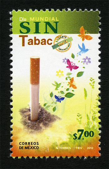 No. Scott: 2787 -- Año de Emisión: 2012 -- Valor Facial: $ 7.00 -- Multicolor -- Perforación: 13 1/4 x 13 -- Tipo de Impresión: Offset Timbre Postal Mexicano multicolor, del lado derecho de la imagen se observa un cigarrillo sumergido en una cavidad y alrededor hay polvo en color café, puede que sea tierra, a un lado del cigarrillo aparecen mariposas, pájaros y flores, al frente y del lado derecho hay un poco de pastizal. En la parte superior está escrito "Día Mundial SIN Tabaco", "CORREOS DE MÉXICO", el valor facial de "$ 7.00" Y "N. TORRES, TIEV, 2012". Para más información favor de dirigirse a biblioteca@mufi.org.mx