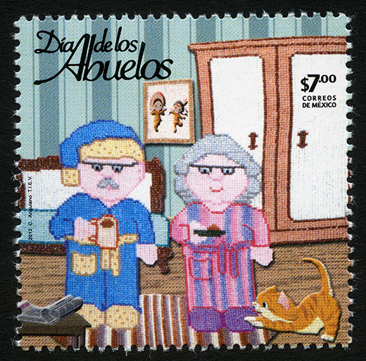 No. Scott: 2789 -- Año de Emisión: 2012 -- Valor Facial: $ 7.00 -- Multicolor -- Perforación: 13 -- Tipo de Impresión: OffsetTimbre Postal Mexicano multicolor, en la imagen aparece una ilustración infantil, al fondo se observa un sillón, un cuadro en la pared y un mueble con dos puertas color blanco, en primer plano se observan a dos personas de la tercera edad, hombre y mujer, ambos están sosteniendo algunos objetos en las manos y están parados sobre un tapete a rayas blanco y café, del lado izquierdo se contempla una mesa pequeña y encima hay una revista abierta, del lado derecho hay un gatito color amarillo con blanco, sus patitas están sobre un zapato de la abuelita. En la estampilla está escrito "Día de los Abuelos", el valor facial de "$7.00", "CORREOS DE MÉXICO" y "2012, C. Anguiano, TIEV".