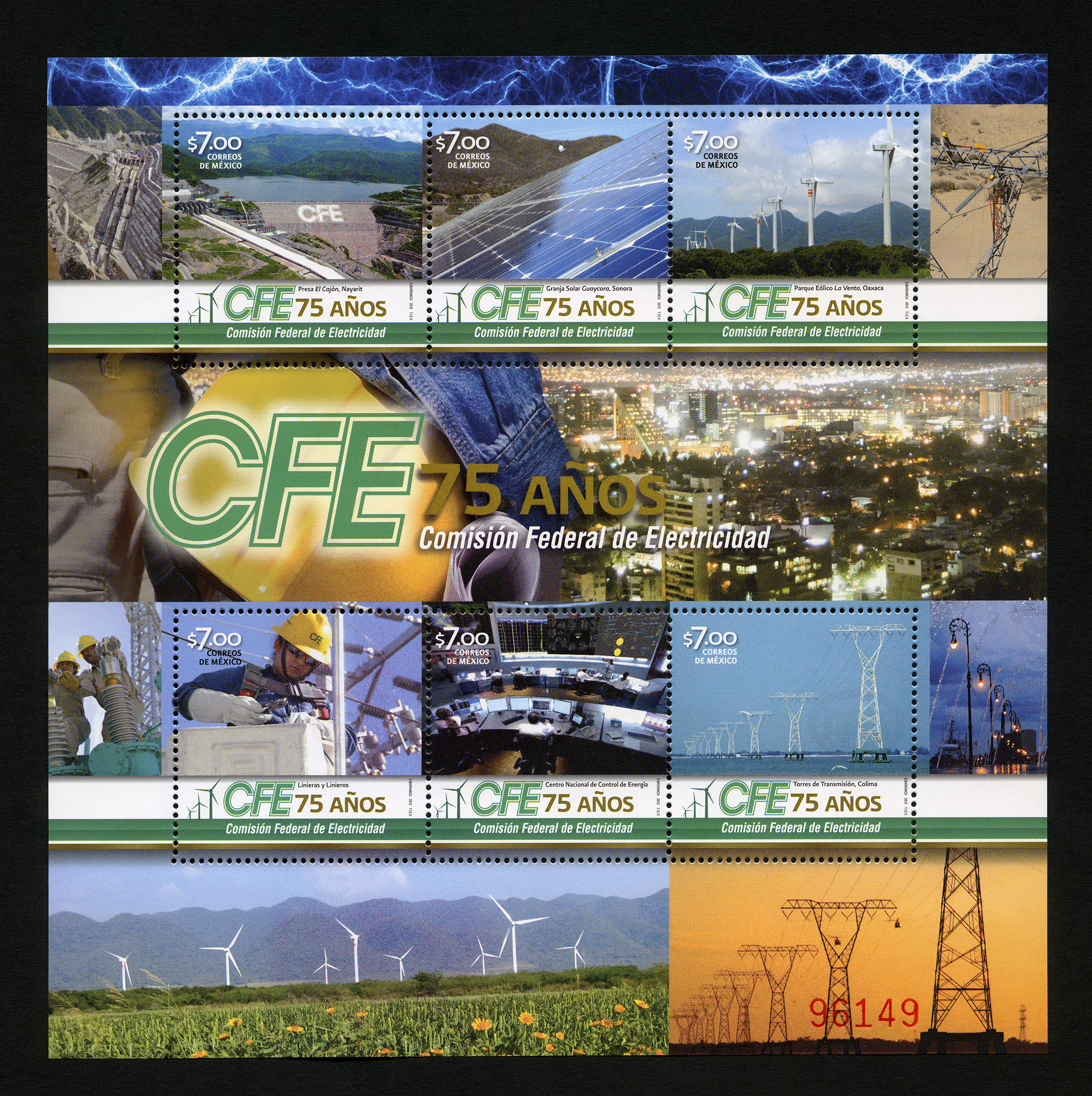 No. Scott: 2790 -- Año de Emisión: 2012 -- Valor Facial: $ 42.00 -- Multicolor -- Perforación: 13 -- Tipo de Impresión: OffsetHoja Recuerdo multicolor de México con seis Timbres Postales, alusivos al 75 Aniversario de la Comisión Federal de Electricidad, en la primera estampilla se observa La Presa El Cajón, en Nayarit, en la segunda, la Granja Solar Guaycora, Sonora, en la tercera, el Parque Eólico la Venta, Oaxaca, en la cuarta, Linieras y Linieros, en la quinta, el Centro Nacional de Control de Energía y en la sexta y última, Torres de Transmisión, Colima. En cada timbre está escrito el valor facial, "CORREOS DE MÉXICO", "75 AÑOS Comisión Federal de Electricidad" y "S. BARRANCA, 2012, TIEV"