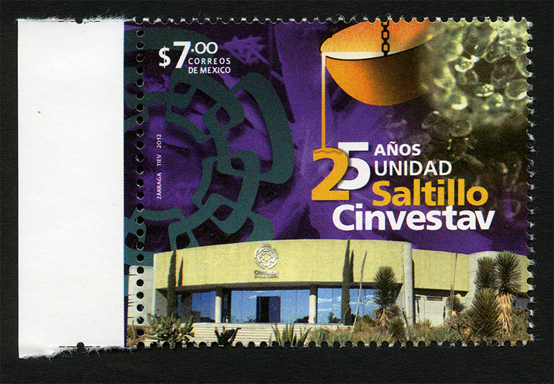 No. Scott: 2794 -- Año de Emisión: 2012 -- Valor Facial: $ 7.00 -- Multicolor -- Perforación: 13 1/4 x 13 -- Tipo de Impresión: OffsetTimbre Postal Mexicano multicolor con borde blanco en el lado izquierdo, en la parte superior del lado izquierdo aparece el emblema del Cinvestav, representada por dos cadenas de cinco eslabones entrelazadas en forma de círculo, en medio se observa una olla fundidora de acero y de lado izquierdo un mineral, en la parte de abajo se contempla el edificio del Cinvestav y en frente hay una área verde de árboles y plantas. En la estampilla está escrito el valor facial de "$7.00", "CORREOS DE MÉXICO", "ZÁRRAGA, TIEV, S012" y "25 Años UNIDAD Saltillo Cinvestav".