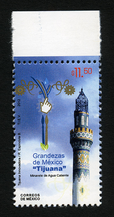 No. Scott: 2797 -- Año de Emisión: 2012 -- Valor Facial: $ 11.50 -- Multicolor -- Perforación: 13 1/4 x 13 -- Tipo de Impresión: OffsetTimbre Postal Mexicano multicolor, al fondo se observa un cielo azul con nubes muy densas, en primer plano aparece el Miranete de Agua Caliente, monumento emblemático, según el Archivo Histórico de Tijuana fue construido en 1930 y era utilizado como chimenea por donde salía el humo de las calderas del equipo de calefacción, las áreas de lavado y planchado, este monumento mide 61 metros de altura y está hecho de azulejo tipo español, en la parte de arriba se observa una corona de fierro. En la estampilla está escrito el valor facial de "$11.50", "Tijuana Innovadora / R. Espíndola B., TIEV 2012", "Grandezas de México" Tijuana", "Miranete de Agua Caliente" y "CORREOS DE MÉXICO".