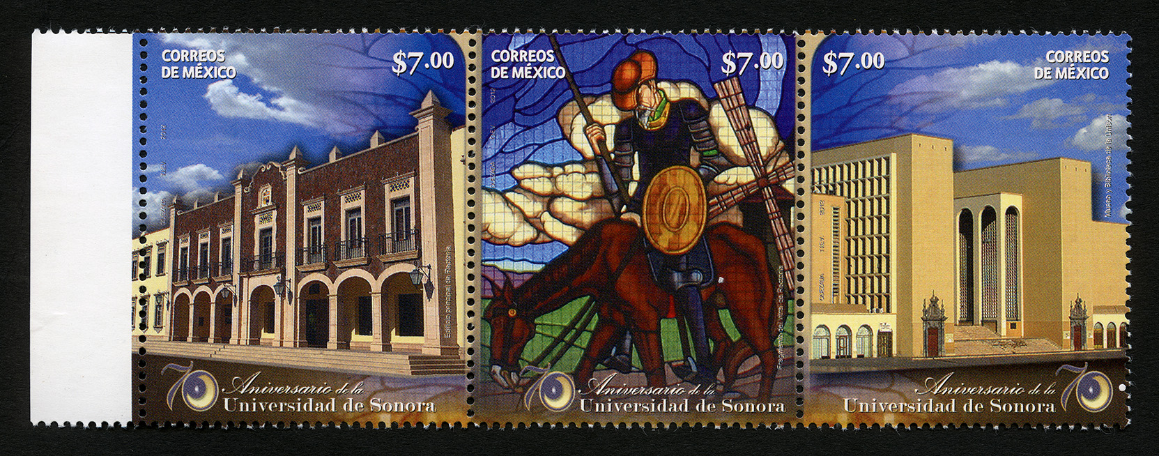 No. Scott: 2795 -- Año de Emisión: 2012 -- Valor Facial: $ 21.00 -- Multicolor -- Perforación:13 x13 1/4 - Tipo de Impresión: Offset Tira de tres Timbres Postales multicolor de México, en conmemoración al 70 Aniversario de la Universidad de Sonora, en ala primera estampilla se observa el edificio principal de Rectoría, en la segunda aparece una fragmento del vitral de Don Quijote de la Mancha y en la última está el Museo y Biblioteca de la Universidad. En cada timbre está escrito "CORREOS DE MÉXICO", el valor facial de "$7.00" y "QUEZADA, TIEV, 2012". Para más información favor de dirigirse a biblioteca@mufi.org.mx