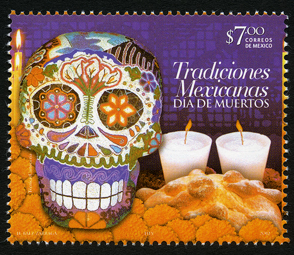 No. Scott: 2801 -- Año de Emisión: 2012 -- Valor Facial: $ 7.00 -- Multicolor -- Perforación: 13 1/4 x 13 - Tipo de Impresión: OffsetTimbre Postal Mexicano multicolor, al fondo de la imagen se observa un papel picado en color morado, más adelante hay dos veladoras encendidas en primer plano aparece un pan dulce con bordes y azúcar encima, flores de cempasúchil en el contorno y una calavera decorada con muchos colores y formas que la hacen ver espectacular. En la estampilla está escrito el valor facial de "$7.00", "CORREOS DE MÉXICO", "Tradiciones Mexicanas DÍA DE MUERTOS " y "ZÁRRAGA, TIEV, 2012".
