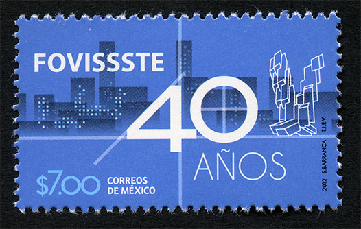 No. Scott: 2806 -- Año de Emisión: 2012 -- Valor Facial: $ 7.00 -- Multicolor -- Perforación: 13 x 13 1/4 -- Tipo de Impresión: Offset Timbre Postal Mexicano multicolor, sobre un fondo azul cobalto, aparece una imagen minimalista que muestra dos edificios, representados por figuras geométricas como son los rectángulos y cuadrados grandes y pequeños, en primer plano está escrito "FOVISSSTE", "40 AÑOS", el valor facial de "$7.00", "CORREOS DE MÉXICO" y "2012, S. BARRANCA , TIEV". Para más información favor de dirigirse a biblioteca@mufi.org.mx