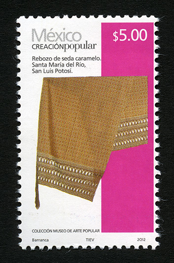 No. Scott: 2493g -- Año de Emisión: 2012 -- Valor Facial: $ 5.00 -- Multicolor -- Perforación: 13 1 /4 x 13 -- Tipo de Impresión: Offset Estucado Timbre Postal Mexicano multicolor, perteneciente a la serie permanente México Creación Popular, en la imagen se observa una prenda de vestir femenina, la cual puede ser elaborada en lana, algodón o seda. Sobre la estampilla está escrito "México CREACIÓN POPULAR", el valor facial de "$ 5.00", "Rebozo de sedea caramelo. Santa María del Río, San Luis Potosí", "COLECCIÓN MUSEO DE ARTE POPULAR" y "Barranca, TIEV, 2012". Para más información favor de dirigirse a biblioteca@mufi.org.mx