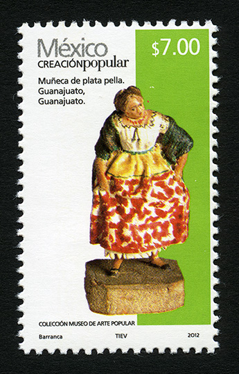 No. Scott: 2499f -- Año de Emisión: 2012 -- Valor Facial: $ 7.00 -- Multicolor -- Perforación: 13 1 /4 x 13 -- Tipo de Impresión: Offset Estucado Timbre Postal Mexicano multicolor, perteneciente a la serie permanente México Creación Popular, en la imagen se observa una muñeca hecha de plata pella, su ropa es colorida, lleva en la espalda un rebozo en color verde, que aparece sobre sus hombros, ella está parada en una piedra de gran tamaño. En la estampilla está escrito "México CREACIÓN POPULAR", el valor facial de "$ 7.00", "Muñeca de plata pella. Guanajuato, Guanajuato", "COLECCIÓN MUSEO DE ARTE POPULAR" y "Barranca, TIEV, 2012". Para más información favor de dirigirse a biblioteca@mufi.org.mx