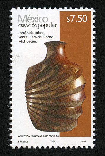 No. Scott: 2500g -- Año de Emisión: 2012 -- Valor Facial: $ 7.50 -- Multicolor -- Perforación: 13 1 /4 x 13 -- Tipo de Impresión: Offset Estucado Timbre Postal Mexicano multicolor, perteneciente a la serie permanente México Creación Popular, en la imagen se observa un recipiente en forma de vaso alto, copa o jarro grande, hecho de cobre y elaborado en el Estado de Michoacán. En la estampilla está escrito "México CREACIÓN POPULAR", el valor facial de "$ 7.50", "Jarrón de cobre. Santa Clara del Cobre, Michoacán", "COLECCIÓN MUSEO DE ARTE POPULAR" y "Barranca, TIEV, 2012". Para más información favor de dirigirse a biblioteca@mufi.org.mx
