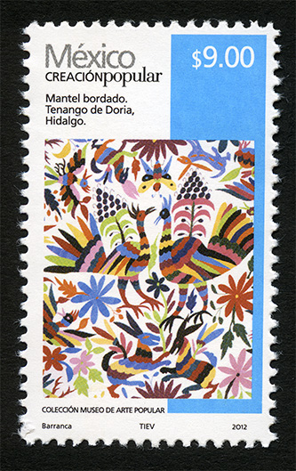 No. Scott: 2501c -- Año de Emisión: 2012 -- Valor Facial: $ 9.00 -- Multicolor -- Perforación: 13 1 /4 x 13 -- Tipo de Impresión: Offset Estucado Timbre Postal Mexicano multicolor, perteneciente a la serie permanente México Creación Popular, en la imagen se observa un mosaico multicolor, que dan forma a flores, árboles y animales, posiblemente esta pieza esté elaborada a mano. En la estampilla está escrito "México CREACIÓN POPULAR", el valor facial de "$ 9.00", "Mantel bordado. Tenango de Doria, Hidalgo", "COLECCIÓN MUSEO DE ARTE POPULAR" y "Barranca, TIEV, 2012". Para más información favor de dirigirse a biblioteca@mufi.org.mx