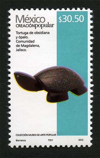 No. Scott: 2505d -- Año de Emisión: 2012 -- Valor Facial: $ 30.50 -- Multicolor -- Perforación: 13 1 /4 x 13 -- Tipo de Impresión: Offset Estucado Timbre Postal Mexicano multicolor, perteneciente a la serie permanente México Creación Popular, en la imagen se observa una tortuga de obsidiana y ópalo, realizada en la Comunidad de Magdalena, Jalisco. Sobre la estampilla está escrito "México CREACIÓN POPULAR", el valor facial de "$ 30.50", "Tortuga de obsidiana y ópalo", "COLECCIÓN MUSEO DE ARTE POPULAR" y "Barranca, TIEV, 2012". Para más información favor de dirigirse a biblioteca@mufi.org.mx