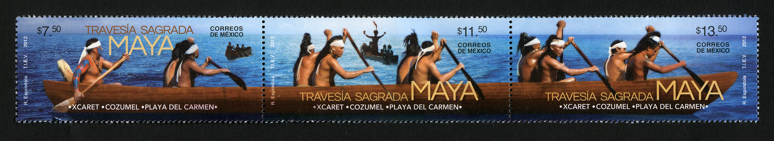 No. Scott: 2809 -- Año de Emisión: 2012 -- Valor Facial: $ 32.50 -- Multicolor -- Perforación: 13 1 /4 x 13 -- Tipo de Impresión: OffsetTira de tres Timbres Postales multicolores de México, en las tres estampillas hay imágenes de la Travesía Sagrada Maya, realizada en Xcaret, Cozumel y Playa del Carmen, este evento se celebra cada año en el Parque Ecológico de Xcaret, en donde más de 300 hombres muestran al mundo su disciplina, la actitud, la fe y el trabajo en equipo para interpretar un ritual sagrado, que realizaban los Mayas en sus canoas para rendir culto a la diosa Ixchel. En cada timbre está escrito el valor facial, "TRAVESÍA MAYA SAGRADA", "XCARET°COZUMEL°PLAYA DEL CARMEN", "CORREOS DE MÉXICO" y "R. Espíndola, TIEV, 2012".