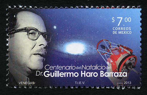 No. Scott: 2816 -- Año de Emisión: 2013 -- Valor Facial: $ 7.00 -- Multicolor -- Perforación: 13 x 13 1/4 -- Tipo de Impresión: OffsetTimbre Postal Mexicano multicolor, al fondo de la imagen se observa un cielo azul y muchos cuerpos celestes que se encuentran en el espacio, en primer plano del lado izquierdo aparece el Doctor Guillermo Haro Barraza, solo muestra su cara en tres cuartos, del lado derecho se observa la punta de un telescopio que explora una galaxia. Sobre la estampilla está escrito el valor facial de "$7.00", "CORREOS DE MÉXICO", "Centenario del Natalicio del Doctor Guillermo Haro Barraza" Y "Venegas, TIEV, 2013".